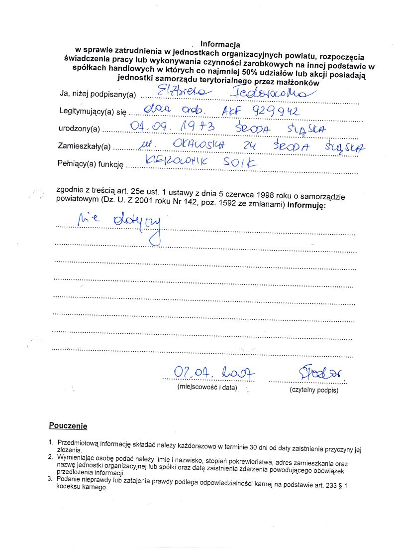 ^ Oświadczenie kierownika w sprawie prowadzenia działalności gospodarczej przez malżonk??w na terenie Powiatu Średziego  oraz zawartych umowach cywilnoprawnych przez małżonk??w z organami powiatu, jednostakami oraganizacyjnymi powiatu i powiatowym osobami prawnymi.